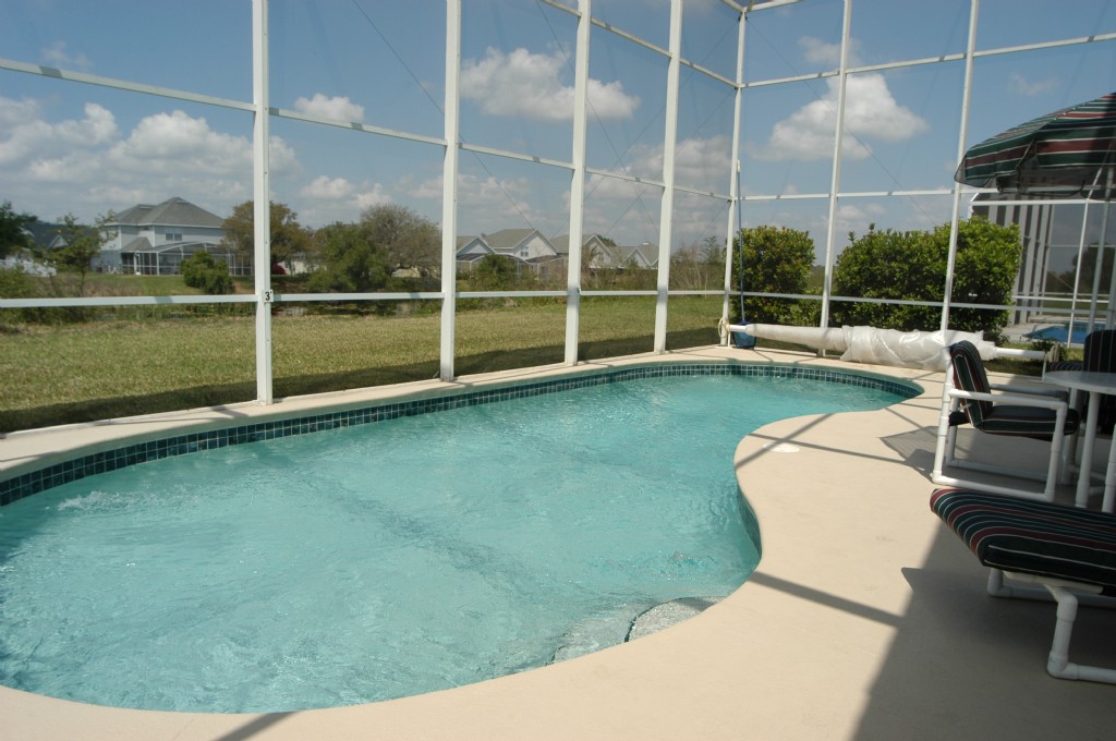 The living area overlooks the large pool and deck area, which is fully equipped with comfortable, high quality, chairs, tables, loungers and the pool has an underwater light. There is a large shaded area with a fan if it gets too hot in the sun. There is sun on the garden and pool area from 9 o’clock until dark The screened pool area overlooks a lake where you can watch the local wild life.