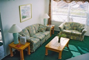 This light and airy villa has vaulted ceilings which, with air conditioning and ceiling fans, keep you comfortable in the Florida heat. The lounge has two large sofas, including a sofa bed, and has remote control TV, VCR/DVD player and stereo unit. There are additional TVs in the bedrooms.