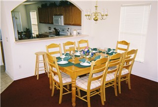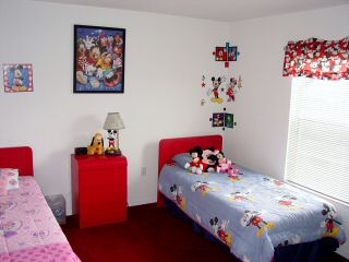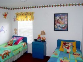 Beautifully furnished. The first master bedroom is downstairs, the second master and the others are located upstairs. A stunning split staircase leads the way! Two bedrooms have double twin beds for the kids and are Disney-themed. Interactive furnishings let the kids hear Mickey or Pooh greet them and wish them good night. The other two bedrooms feature queen-sized bedding...and of course cable-tv, along with the master bedrooms.