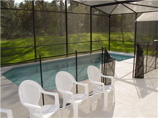 The heated and screened private pool has the coveted southern exposure (important for sun on the pool)and borders on a forest preserve. A covered area lets those who want shade lounge by the pool along with the sun-seekers. There is not another pool behind us, just acres of protected woods. We have one of the few villas with a (removable) safety barrier between the lounge area and pool..a MUST if you have young children in your group!