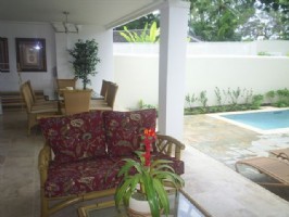 The Master bedroom occupies the entire upper level and from the bedroom terrace there is a partial sea view as well as a view of the resort swimming pool. The Master bathroom is also complete with a shower and large tub. The first floor comprises of 2 further bedrooms sharing a terrace and ensuite bathrooms with showers only. The ground floor comprises of the living room, kitchen and fourth bedroom. This room is not ensuite but shares the powder room(which is right next to the room) which is complete with a shower. The living room opens onto a patio for outside dinning near the pool.