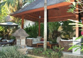 Large folding glass doors in the living/dining room open up on two sides to the garden with many tropical plants and the swimming pool, and ceiling fans provide additional ventilation if required. Furnishings include a dining table for 8 guests and comfortable sofas. Next to the swimming pool two spacious "Bales" (gazebos); one with comfortable sofas, the other with large day beds.