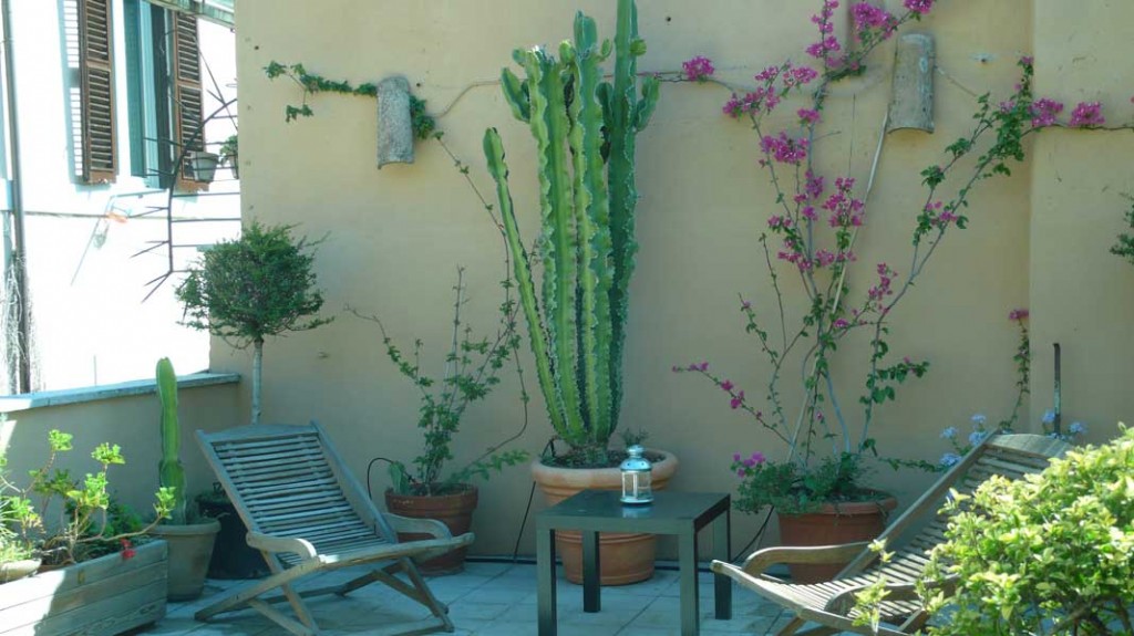 The Renzi Terrace apartment is a spotless, bright and characteristic one bedroom apartment situated at the top floor of the two-story 16th century building (with no lift). This vacation rental apartment consists of: (i) a roomy living area / dining area with two shiny windows and wood floors provided with TV, double sofa bed, a tasteful round glass dining table with chairs and, a small kitchenette with refrigerator inside the wardrobe, (ii) an intimate master bedroom, (iii) an highly refined clean and fresh bathroom with tub and, (iv) a wonderful, big terrace where to sunbath and enjoy pleasurable and relaxing moments with rectangular table and chairs seating up to 6 for outdoor meals and comfortable deckchairs.
