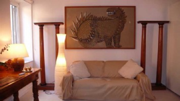 This is a 50 sq. meters vacation rental apartment consisting of (i) very nice living room with dining table and chairs, comfortable long leather double sofa bed, excellent for lounging or napping on during the day and for sleeping at nights, (ii) a night corner with single bed or, two separate trundle twin beds and TV, (iii) en-suite bath with shower, and (iv) small kitchenette.