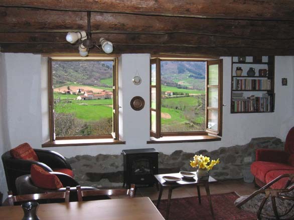 On the ground floor there is a spacious living area with dining table for six, and comfortable chairs, under a beamed ceiling. The two windows look out over the valley, with views down to the river and up to the hilltops opposite. There is a semi-enclosed kitchen area with gas cooker, fridge-freezer, top-loading washing machine and cupboards. Above, there are three bedrooms, two with double beds and one with two twin beds.