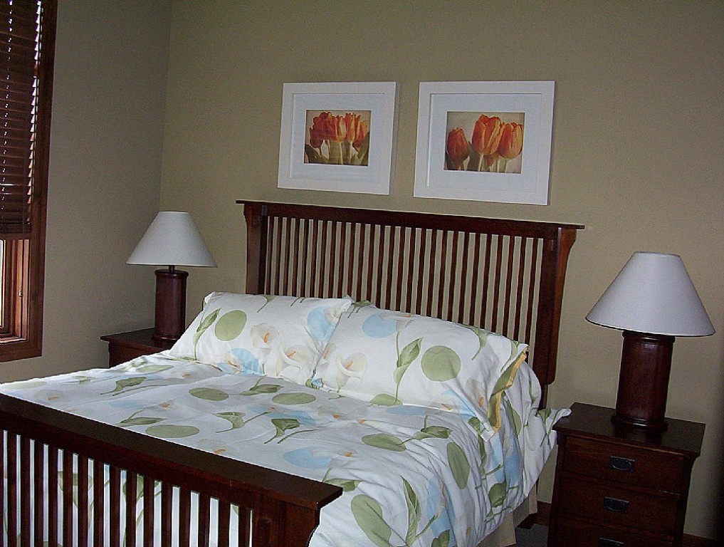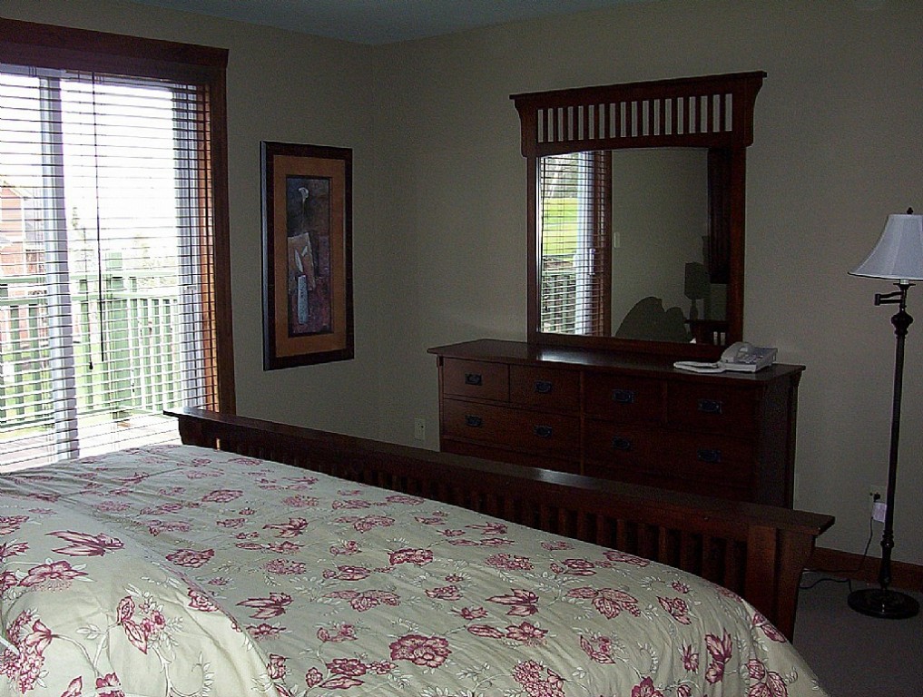 Three bedroom properties span two levels with the lower level being the principal living area. There are two bedrooms on this level, one having a queen bed the other having a bunk bed capable of sleeping three with a double on the bottom and single on top. There is also a separate twin in this bedroom which will allow a capacity of four guests to sleep in three beds. The living room can accommodate two more guests having a queen sleeper sofa. Upstairs, is the master bedroom having a king bed and a private full bath. The master bedroom also has a private balcony offering guests views of both Lac Tremblant and the ski area.