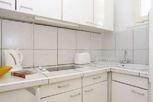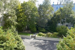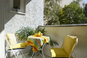 Eating space for three people. Balcony with view onto a garden. The full equipped kitchen with electric stove, refridgerator, dishes from wine glass to frying pan, cutlery, coffee machine, toaster serves a quick breakfast as well as the delightful extended dinner. The balcony looking out into the green rounds off the apartment.