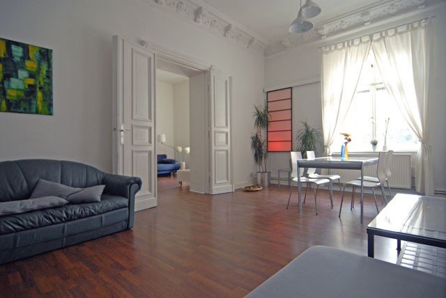 3-room-apartment (93 sqm) in generous ‘belle etage’ (raised ground floor) of a grand period building with high stucco ceilings, with two living rooms, full equipped kitchen and friendly bed room. A comfortable futon bed (180 x 200), a large extendable sleep couch (150 x 200) including sufficient bed clothes and towels. Eating space for six people with fascinating view of Winterfeldtplatz.