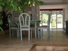 * Dining area - a galleried landing running around the perimeter of the first floor overlooks the raised dining area. Double glass doors at the rear open into the pool and its surrounding areas.