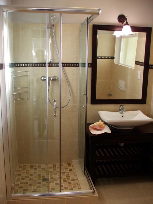 The Bathroom has a spacious shower enclosed in a glass cabin, a basin with lots of storage space underneath and a big mirror. The taps are all modern mixers for the immediate right water temperature. Soft towels are supplied.