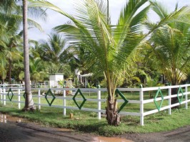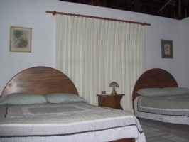 The vacation rental retreat is gated and surrounded by a white rail fence with green diamonds. The onsite caretaker and the night guard maintain the security of the property. Each large hotel room has hot water in the private bath, tile flooring, air conditioning, ceiling fan, and covered tile porch with hammock. One room has 1 double bed. The other two rooms have 2 double beds and 2 single beds, bunked. The fully-equipped kitchen and open-air dining terraza are located in an adjacent building.