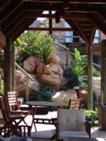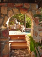 The Garden Studio is a one room apartment that offers a king bed and en-suite bathroom with glass-enclosed shower. Kitchenette, SATV, wireless internet, safe, toiletries. Outdoor sit-out area patio. Rustic stone steps to enter.