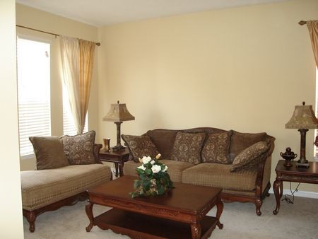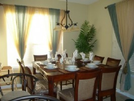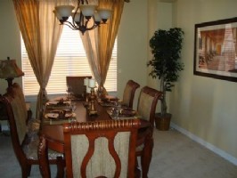 The formal dining room and living room are tastefully decorated and warmly inviting. These two rooms open to each other and they are beautifully and elegantly coordinated. Warm, rich wood and plush fabric create a truly refined dining and lounging experience. The ambience here is accentuated with gorgeous lamps and light fixtures.