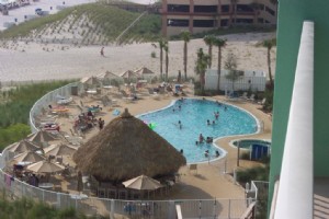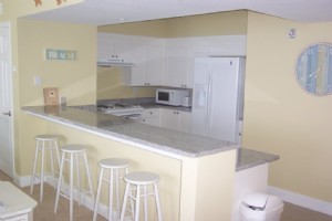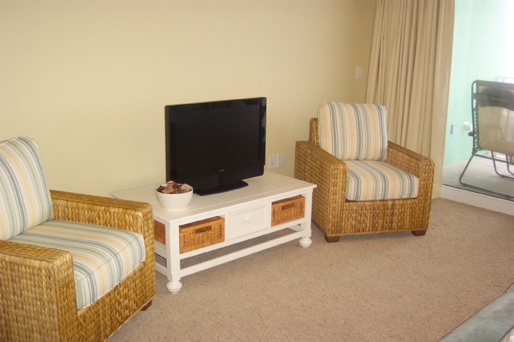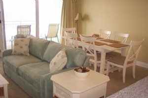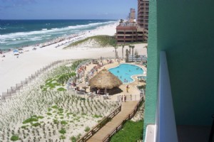 Brand new Gulf-front condo, 6th floor in Panama City Beach. This condo is new in 2007 and completely decorated by a professional decorator in beach/cottage decor in July 2007. The condo sleeps 6 people (one king, 2 bunks, and a pullout couch.) There is one bedroom with a full private bathroom attached. There is a second full bathroom down the hallway. The kitchen has all white cabinets, with granite countertops, and has all the ameneties for a longer stay. The kitchen is open to the great room, which leads out to the balcony. The large balcony overlooks the beautiful Gulf of Mexico, the pool, and the tiki bar. There is a Starbucks in the complex, for morning coffee on the balcony! There are also 2 flat screen TVs with DVD players (one in the great room and one in the bedroom.) We are currently booking for the 2007 holiday season and for family Spring Breaks in 2008. We have Christmas and New Years weeks available! Email us with the dates you are interested in and we can give you a price and our full brochure with pictures!
