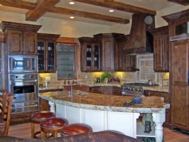 The state-of-the-art kitchen is a chef’s dream with all commercial Viking appliances. The beautiful, thick granite slabs on the countertops and island, along with the copper farmer’s sink and range hood are some of the elegant finishes in this lavish kitchen. The knotty alder cabinets are creatively designed and custom built.