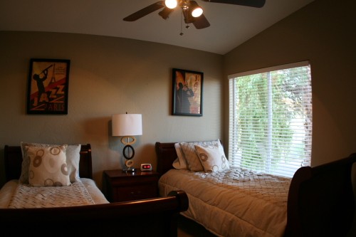 The home has 3 bedrooms and 2.5 bathrooms and can sleep up to 8 with a large fold out sofa. The Master Suite is very spacious with a 10-jetted tub, separate walk-in shower, sitting area and private fireplace. There are 2 interior dining tables that can accommodate up to 12 and one exterior table that can accommodate up to 6. The backyard is a great entertaining and relaxing in the covered sitting area or getting some sun on the lounge chairs. There is a 2-car garage for parking with a separate RV gate if needed.
