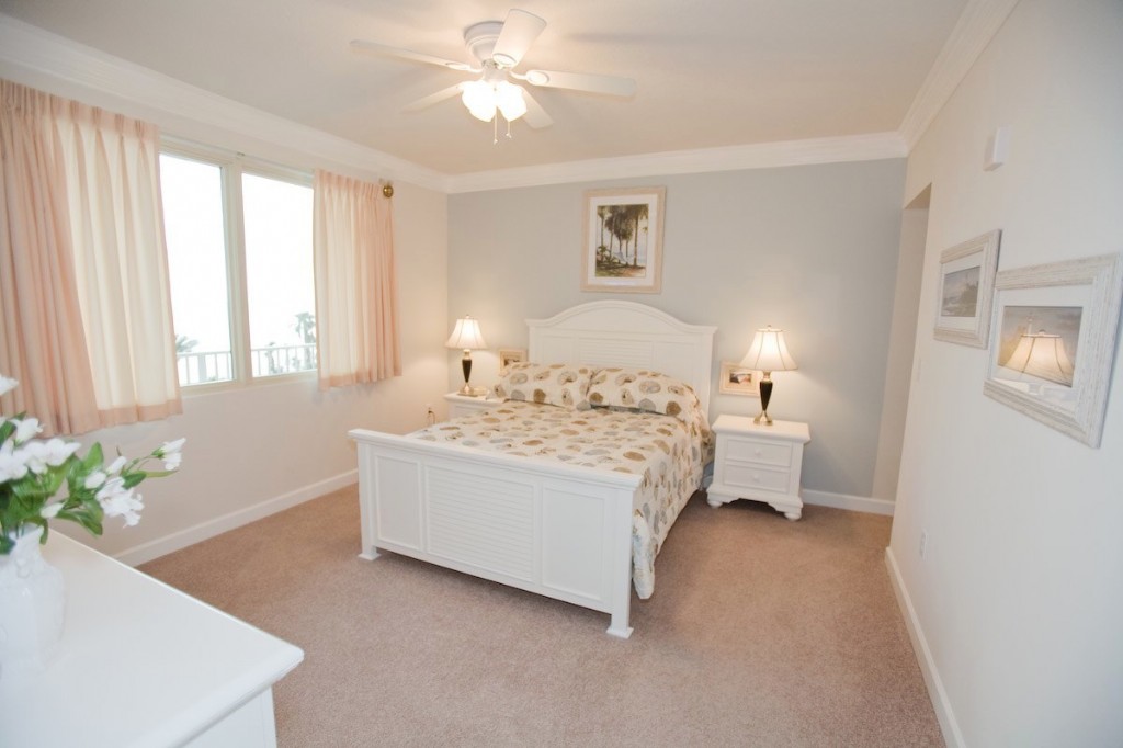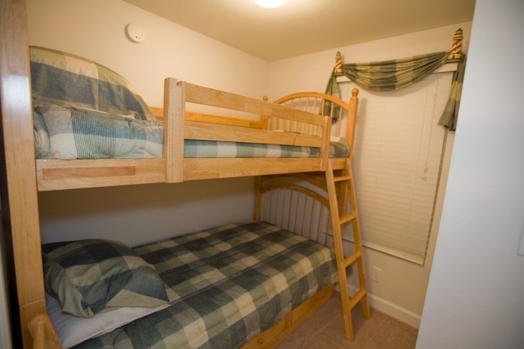 There is 1 full bedroom and one bunk with 2 private baths. The master bedroom has a queen-size bed and the bunk beds are each twin size. The master bedroom has a 26” TV. Both bathrooms are marble. Both bathrooms house a combination tub/shower.