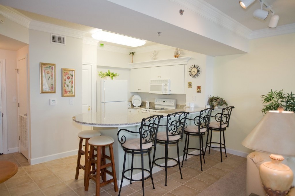 The kitchen is equipped with dinnerware to serve 8. The condo also has a coffee maker, toaster, blender, and pots and pans for your convenience.