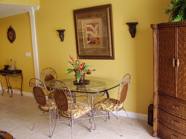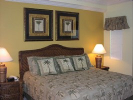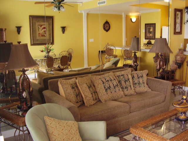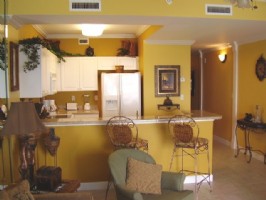 This penthouse offers 9+ foot ceilings and crown molding throughout; a gulf front Living / Dining / Kitchen areas, all with views of the Gulf and a 32" color TV with DVD/VCR and queen sized sleeper sofa; a Dining area with a dining table for 6; a breakfast bar; a fully equipped kitchen with granite counters, side-by-side refrigerator with in-door ice-maker, smooth top range, dishwasher, and all the other items needed to make you feel at home; a huge master suite (400 sq. ft. approx.) with king sized bed, sitting area, 27" television and VCR, private master bath with 9 foot double bowl vanity and 2 person whirlpool tub, and more (finally ... privacy from the kids).