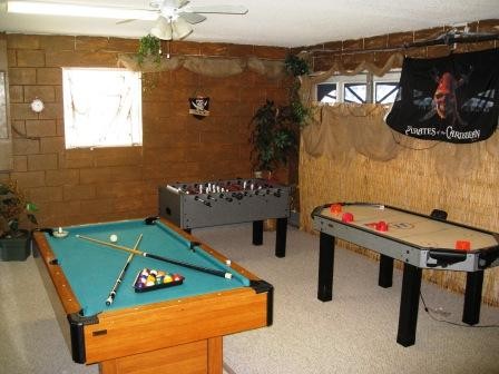Welcome to Disney's Beach Bungalow! Located in the popular Indian Ridge development. This is a beautiful home only 3.5 miles from Disney. 4 large double bedrooms, 2 bathrooms and south facing, fully private pool and garden. Also now includes FREE UNLIMITED LOCAL, LONG DISTANCE AND INTERNATIONAL CALLING! The open plan lounge has 2 large sofas, Cable TV, DVD Player, VCR and Stereo System. The lounge leads to a beautifully decorated dining area, which overlooks the pool. There is a fully equipped kitchen and breakfast area with dishwasher, microwave, large fridge, coffee machine and everything you will need for your stay. There is also a separate Family Room with sofa bed, TV, Cable & Playstation 2. Full laundry facilities with a washing machine, dryer, iron and ironing board are provided. Full linens and towels are also supplied. The Master bedroom has a King size bed, Cable TV and ensuite bathroom with walk in shower, and a door leading to the pool area. The second bedroom has a Queen size double bed and cable TV. There are 2 further twin bedrooms, one decorated in the Nemo theme and the other in a Simba theme. All bedrooms have ample wardrobe space for storage. Outside there is a large heated swimming pool with decking area. There is ample seating for all the family and also a NEW two-burner gas BBQ. The large south facing garden is fully fenced and private which is great for the children to play in. Finally there is a fantastic Pirate themed Game Room with a Pool Table, Foosball Table, Air Hockey Table and Darts Board and X-box. We know you'll enjoy your stay at Disney's Beach Bungalow.