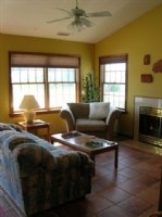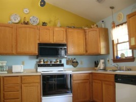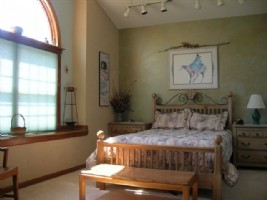 Beautiful surroundings - custom interior painting. Master bedroom features queen bed, cathedral ceiling, walk-in closet, and palladian window. The guestroom has full bed and the second guestroom has a queen. Sofa in living room can do in a pinch! Living room and kitchen also has cathedral ceiling.