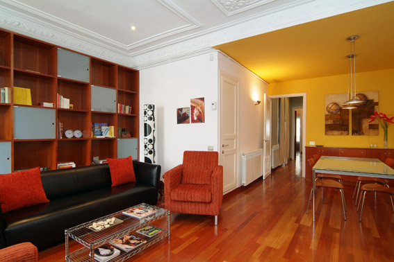A 3 metre ceiling height has been maintained throughout the apartment together with the original ceiling decoration and detail and the thoughtful placement of furniture only serves to enhance this. The floor is cherry wood parquet in all communal areas with the exception of the bathrooms which are finished in tile and natural stone. Nearly all the large pieces of furniture are also made of cherry wood, permitting harmonious visual integration.
