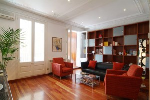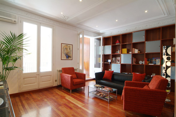 The apartment is situated in a building of the traditional “Eixample” town house style, characterised by a large central stairway and open sided lift in wood panelling with two apartments per floor. As a result, the apartment describes an elongated rectangle, with exterior facades at the two ends, allowing through ventilation. The internal layout includes a living - dining area, two bedrooms, two bathrooms and a kitchen.