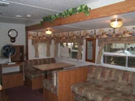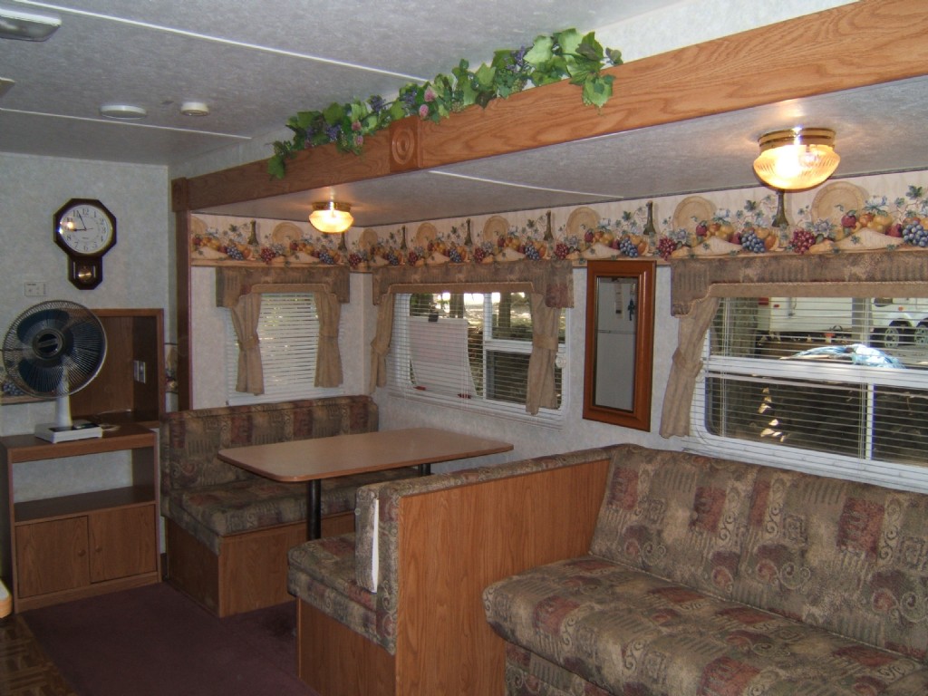 38x24 trailer/ sleeps 6/ 10x38 ft deck w/gas grill/picnic table/fire ring/fully stocked & furnished/BYO linens, towels and food & beverage.