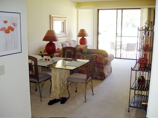 Fully furnished - 2 bedroom, 2 bathroom, single car garage, pull-out sofa-bed with approximately 1200 square feet of living space in a quiet, friendly complex with three sets of pools, spas, and tennis courts, mature fruit trees (lemon, grapefruit, orange) and large well maintained green spaces.