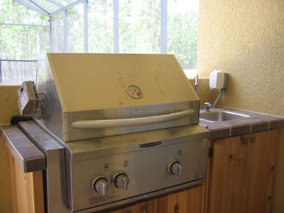 Summer kitchen with sink and custom built BBQ includes cedar cabinet and tiled counter top.