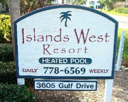 The Islands West Resort, located at 3605 Gulf Drive in Holmes Beach, is a ground level resort with a large heated pool. Enjoy the relaxing charm of island living, when you stay at the Islands West Resort you may feel that you've gone back to a simpler time. The resort consists of four, one bedroom, one bath units and one two bedroom, one bath unit and one studio apartment. All units feature a private garden courtyard with charcoal grills. The resort is a short block to the white sugary beaches of the Gulf of Mexico. It's a great location! Each room is equipped with everything needed to make your vacation getaway perfect, including Cable TV, VCR, stereo, iron, and hair dryer. A complimentary washer & dryer are located on site for your convenience as well as a supply of beach umbrellas, beach carts and beach chairs. There's even a free video library for your enjoyment. The Islands West is a wonderful and affordable property and would be perfect for groups up to twenty-four and ideal for special gatherings. The one-bedroom units sleep four with a queen size bed and a sofa bed. The two bedroom unit sleeps six with a king size bed, queen size bed and a sofa bed. The studio sleeps two and has a hot plate, microwave, toaster oven, and mini fridge. A full size murphy bed folds away to provide more space when not in use. Units five and six have a connecting door to form a two bedroom, two bath suite. We hope you'll come experience the wonderful mix of southern and island hospitality. Each suite has a full kitchen (except studio) with stove, microwave, and refrigerator. Some units feature dishwashers.