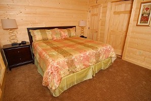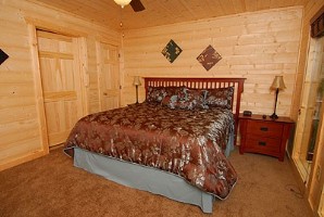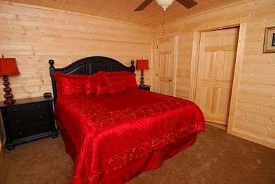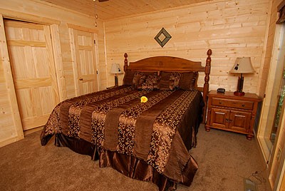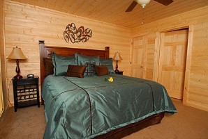 rental cabins at Parkside Resort. Features include 5 bedrooms, each with a king bed and it's own fireplace,