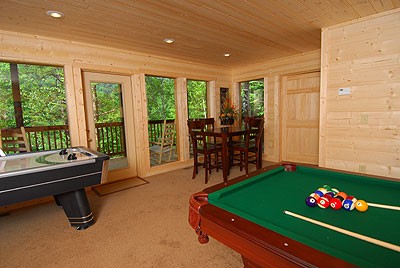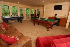 with pool table, poker table and air hockey table, wet bar with flat screen TV, large flat screen TV in the living area,