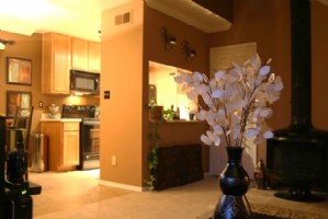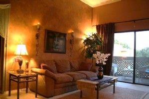 The Sunscape condos are conveniently located near Old Town Scottsdale adjacent to a golf course. This 2 bedroom loft will sleep 4 comfortably with 1 king bed in the master suite and 1 queen bed in the private loft. This unit opens into the living room that features vaulted ceilings, a fireplace and stairway access to the upper loft area. The kitchen and dining room are located to one side of the unit with views of the living area; the master suite and bathroom are located to the other side.