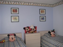 The third bedroom is a Mickey Mouse themed room with two twin beds.