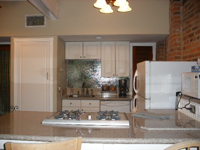 Gourmet kitchen is fully equipped with dishes, pots, etc. Granite counter tops, cherry hardwood floors and new furniture, microwave, gas stove, dishwasher and garbage disposal!