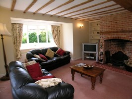 w Spacious lounge with oak beams, inglenook open fireplace, 2 leather settees, TV, DVD player, radio / CD player