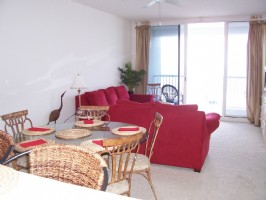 Our unit offers an upscale unit, with designer tile and carpet. The master bedroom has a queen, private bath with walk in glass shower as well as a jetted tub, flat screen tv, and opens onto the over sized balcony. Second bedroom has a queen bed and flat screen tv. Third bedroom shares the hall bath and features "Ship Shape" twin bunks. With a full size washer and dryer, your packing needs are a minimum. The living area is welcoming with a flat screen tv, dvd, and over sized balcony. The kitchen has all you need to create a signature meal and with seating for 10, your family can enjoy dinner beach side just by opening the curtains.