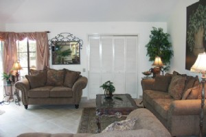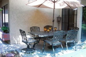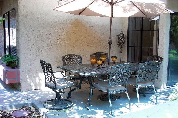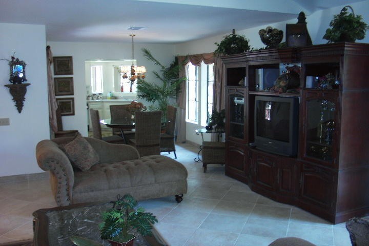 Situated in South Palm Springs Close to WaterPark (Knotts Soak City0 , 5 mins from old down town , palm springs . 1 king bedroom with bathroom 1 queen bedroom and a full bed, also sofa bed in living room large private patio with bbq , steps to pool , 4 tv's vcr, dvd cd, stereo washer dryes dishwasher fully stocked with china glassware aprox 1400 sq ft 2 car garage , luxuriously furnished , not your typical rental.