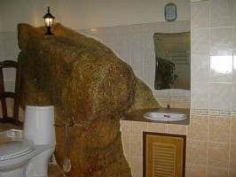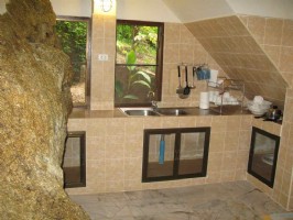 On the first level is the fully equipped kitchen, the entrance area, with an outside breakfast patio, and the bedroom with an enormous, en-suite bathroom, and king size bed. The bathroom features hillside granite boulders incorporated into it’s design.