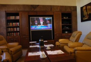 • There is a three-seat leather sleeper sofa and 6 comfortable leather reclining chairs with built-in footrests that can be arranged in a variety of configurations: conference style, theatre style, or as a guest room using the sleeper sofa