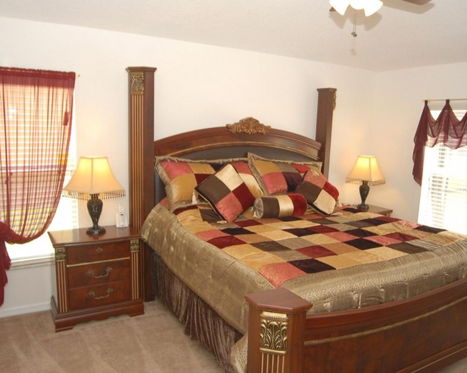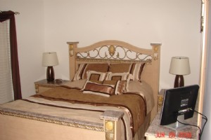 The tastefully decorated Master Suite overlooks the pool and has a King size bed with memory foam mattress, a 19" LCD HDTV and DVD player. The master en-suite bathroom has a huge garden tub and a walk-in shower with a hand held massaging shower head. The bathroom is equipped with a hair dryer and hair curling iron, and leads into the walk-in wardrobes with ample hanging space. A pack-n-play baby bed is provided for your convenience.