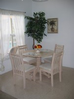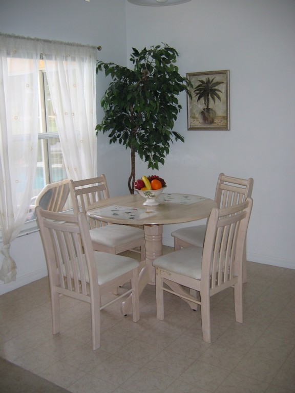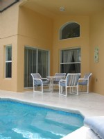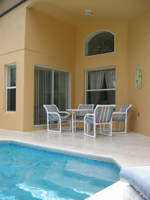 Adjoins pool area with table chairs and lighting, offering some shade from the Florida sun.