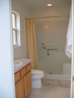 En-suite Large shower cubicle, hand basin, toilet, with door access to pool.