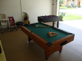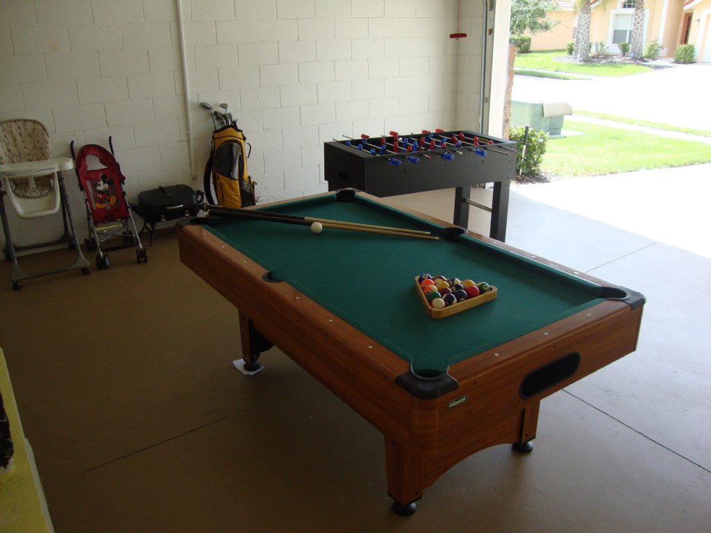 GAMES ROOM WITH POOL TABLE AND FOOSBALL TABLE.