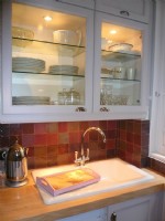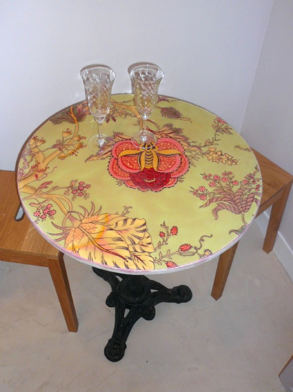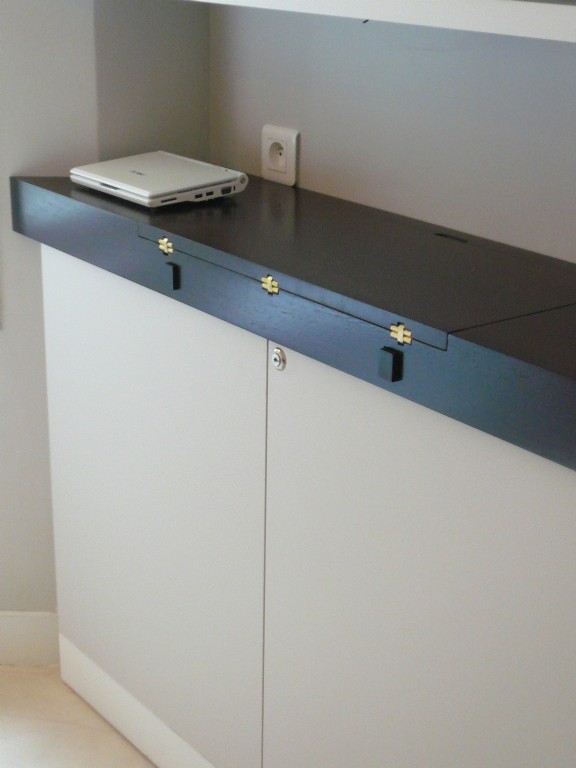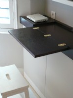 All the electrical equipment ( flat LCD TV, DVD, Music System, Cable and WIFI) are above the desk and can be hidden away with a roll down linen curtain.
