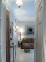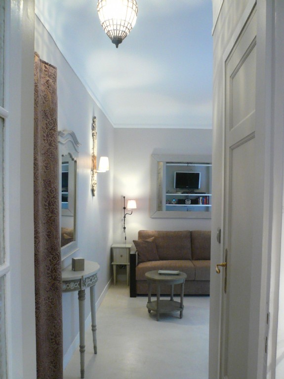 The apartment is decorated in soft and natural tones and textures, with linen and silk, velvet curtains and lamps, ceramic tile, natural wood counter and desk, tinted stone floors and soft lights.