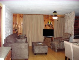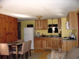 Enter the cottage and pass by the first floor bath. Step up into the main room where you will find a fully equipped kitchen open to the living room. The living room has all the basics covered for a quiet evening at home. A full size sofa, chair and ottoman are great places to relax and watch the flat screen TV with Dish satellite and DVD player. Our nook off the living room has bunk beds, which allows room for your castaways or a chance to relieve your childhood.