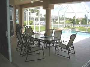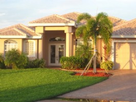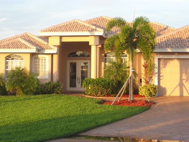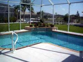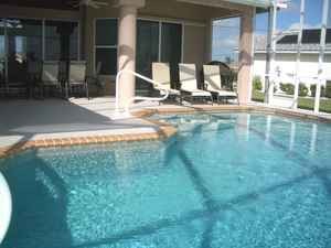 Enjoy a relaxing vacation in this new villa located in southwest Cape Coral, on a canal with gulf access. Boat avialable to rent at ONLY $600/week! The attractive large corner lot with its luxurious landscaping and paved circular driveway lead you to a welcoming high entrance and glass features of the entryway. This beautiful home offers soaring ceilings and over 2400 sq ft of air-conditioned, tiled open space living area that include formal dining room, living room, family room and well-appointed kitchen with Corian counter top, breakfast bar and morning nook, as well as huge sliding doors to the pool and over-sized patio. High standard furnishings throughout make this house particularly enjoyable. The master suite with king-size bed and private access to the pool has an elegant passage to the spacious master bath with Jacuzzi tub, walk-in shower, separate restroom and large walk-in closet. The second and third bedrooms have queen-size beds.
