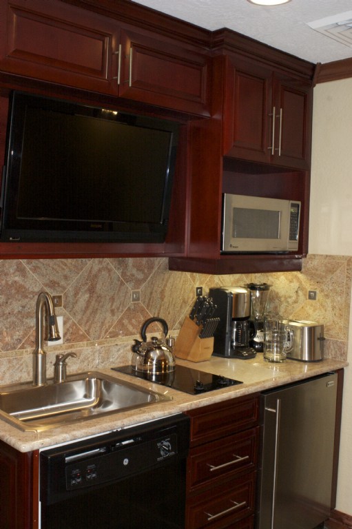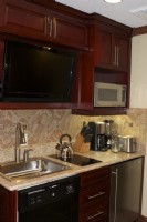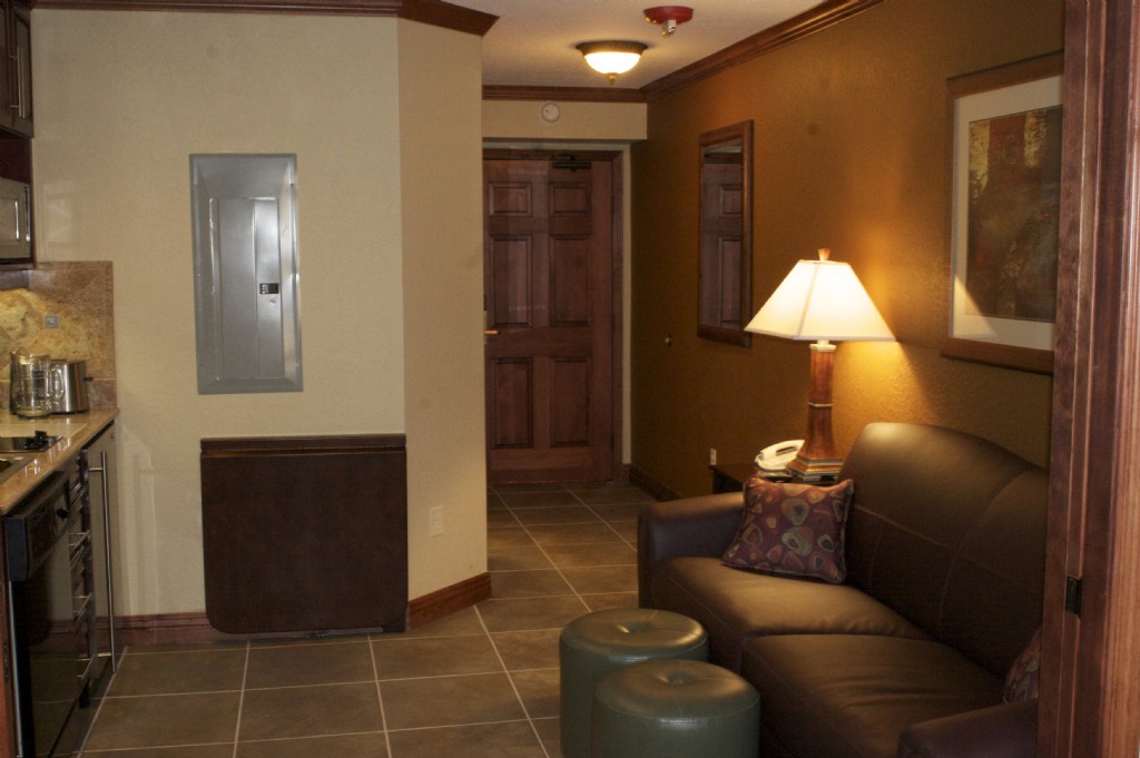 These studios are BRAND NEW. The bedroom has a king-sized bed with pillow top mattress and duvet, nightstand, dresser, and 42in LCD TV. Despite being a studio this room can be closed off from the remainder of the unit by a sliding wood door. The living room has a leather sleeper sofa, coffee and end table, and 42in LCD TV. The kitchenette comes equipped with a refrigerator, dishwasher, sink, stove top, and microwave. The bathroom has granite counters and a steam shower.